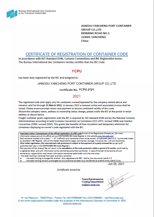 6月10日,從國際集裝箱局(法國)傳來喜訊,鹽城港集團(tuán)自備的200只集裝箱,全部完成前綴YCPU的注冊(cè)登記手續(xù)(證書編號(hào):YCPU-2121),正式成為可以全球流通的集裝箱。自此,鹽城港自備箱在世界上有了自己的名字—“YCPU”,拿到了自己的“環(huán)球通行證”。