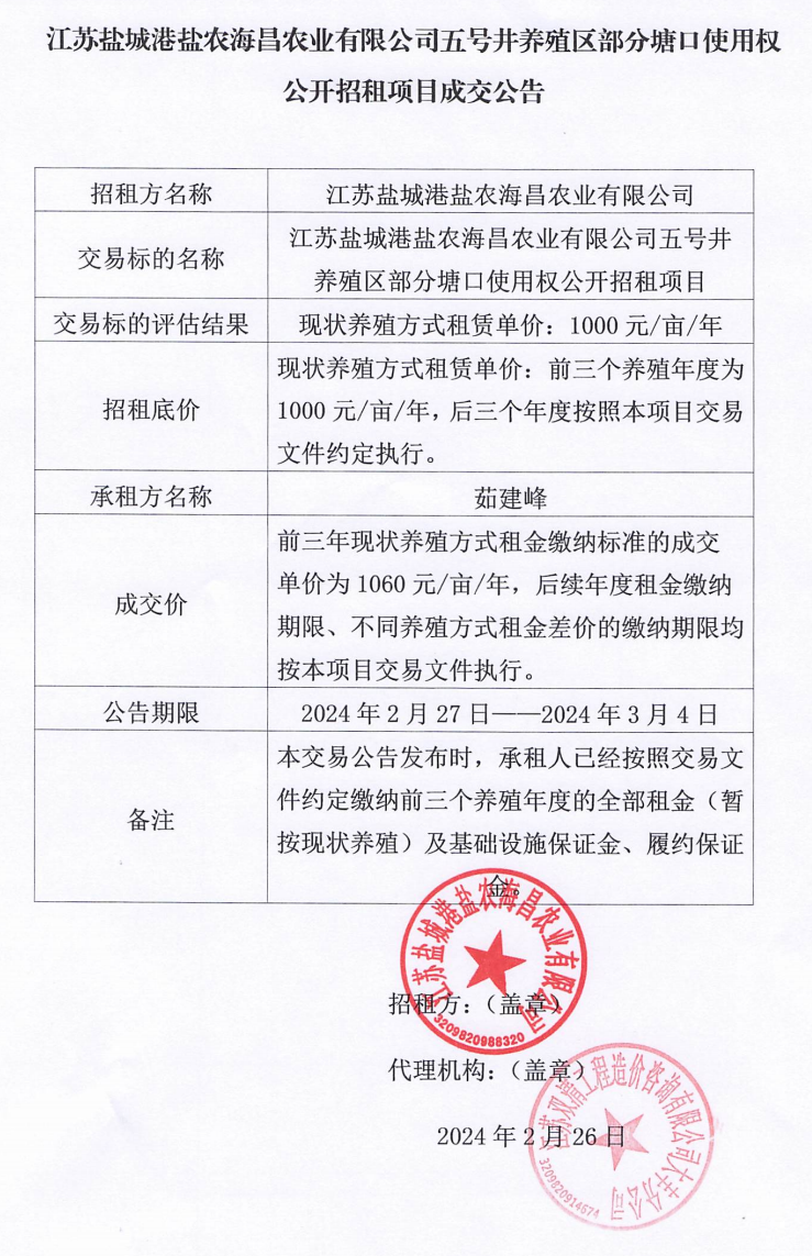江蘇鹽城港鹽農(nóng)海昌農(nóng)業(yè)有限公司五號(hào)井養(yǎng)殖區(qū)部分塘口使用權(quán)公開招租項(xiàng)目成交公告