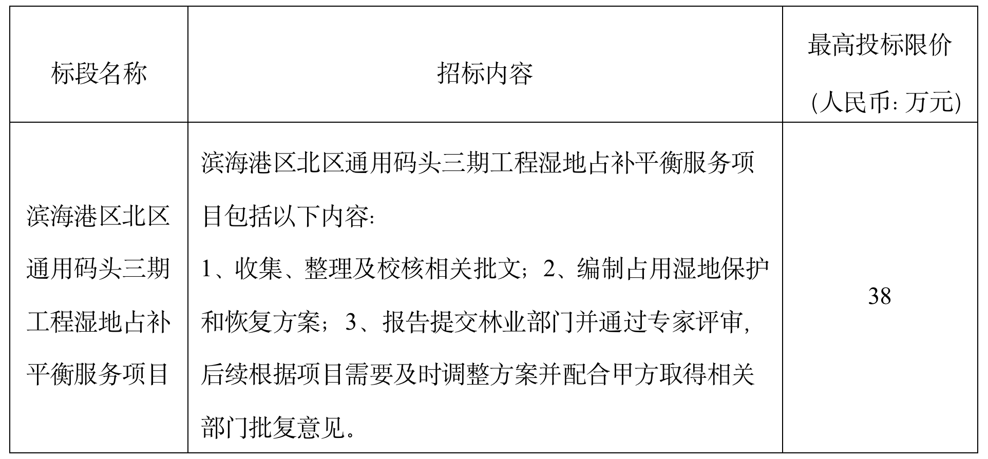 (5)項(xiàng)目標(biāo)段劃分:濱海港區(qū)北區(qū)通用碼頭三期工程濕地占補(bǔ)平衡服務(wù)項(xiàng)目共劃分1個(gè)標(biāo)段,標(biāo)段信息如下:
