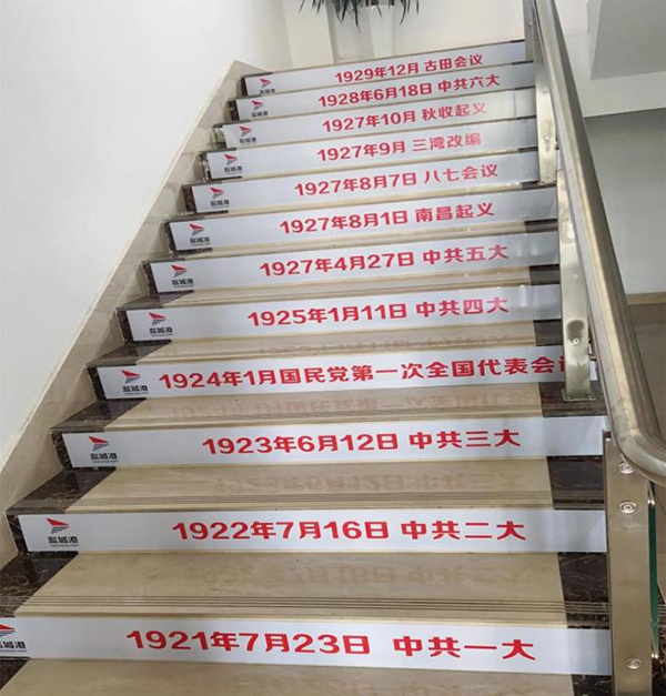 針對廣大干部職工工作實際,響水港區精心設計,細心研究,將學習形式和載體不斷創新。近日,響水港區創新打造“樓梯課堂”,將黨史發展時間歷程貼印在樓梯上,方便大家在上班閑暇時,無形地將黨史知識學進腦子里?!皹翘菡n堂”的每一個階梯同時也代表著黨的每一個發展歷程,一步一臺階,扎扎實實譜新篇。響水港區員工普遍反映這個學習方式有創意有實效,鞏固加深了他們對黨史的掌握程度,也提高了他們學習黨史的興趣。