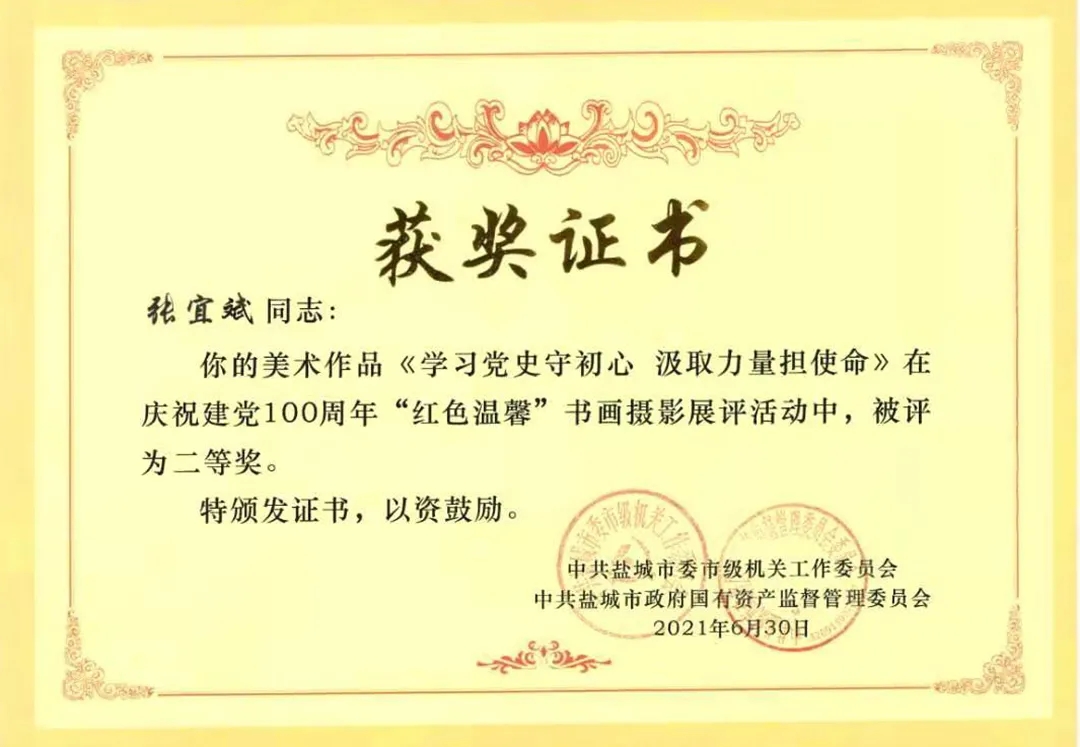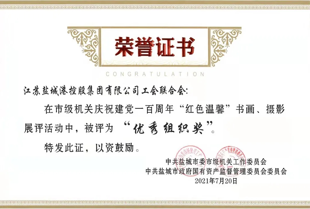 近日,中共鹽城市委市級機關工作委員會與中共鹽城市政府國有資產監(jiān)督管理委員會委員會發(fā)布《關于市級機關慶祝建黨一百周年“紅色溫馨”書畫攝影展評活動的表揚通報》,江蘇鹽城港控股集團有限公司工會聯(lián)合會榮獲“優(yōu)秀組織獎”,響水港區(qū)張宜斌同志獲得“美術作品類 二等獎”。