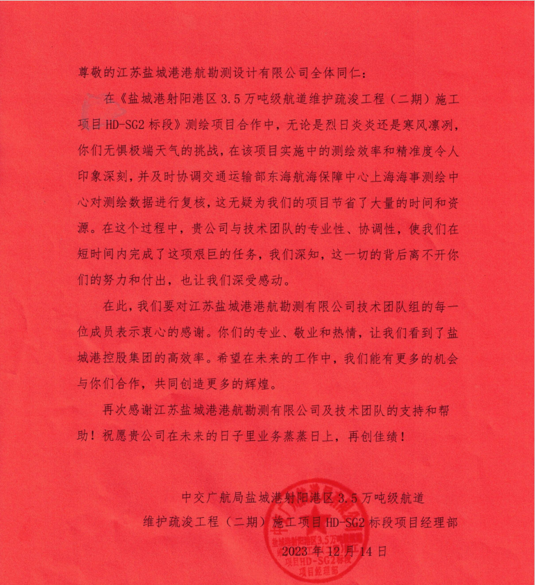 近日,鹽城港港航勘測設計公司收到來自中交廣航局鹽城射陽港區項目經理部的感謝信,感謝港航勘測設計公司及技術團隊的支持和幫助。