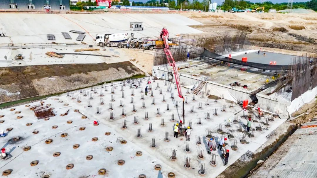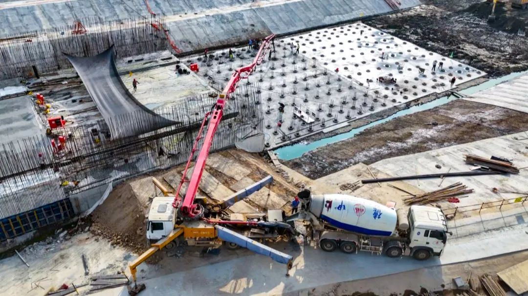 工人們正在進(jìn)行船閘底板混凝土灌注