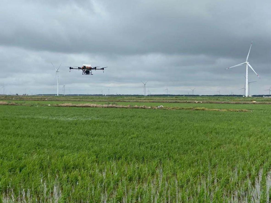 連日來,在葦魚場田間上空,一架無人機正在執(zhí)行飛防任務。半空中,無人機機翼呼呼作響,田里的農作物如水浪般快速波動翻轉,霧狀的藥滴被均勻地覆蓋到作物面上。僅僅幾分鐘,十幾畝田地的飛防工作完成。隨后,工作人員熟練操控無人機降落、更換電池、續(xù)裝藥水,無人機再次騰空,飛向了另一片田地。
