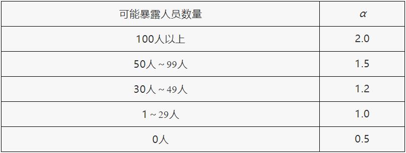 α— 該危險貨物重大危險源所在港口企業(yè)作業(yè)區(qū)邊界外暴露人員的校正系數(shù)。