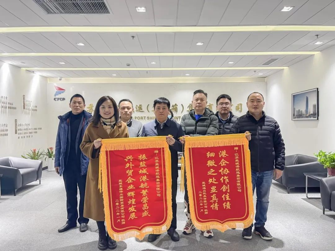 1月25日,農(nóng)歷小年這一天,南京海聆夢、鹽城東源偉業(yè)和鹽城海貝玩具三家公司不約而同來到鹽城港航運集團,分別將寫有“高效服務心系企業(yè)”、“振鹽城港航繁榮昌盛,興外貿(mào)企業(yè)輝煌發(fā)展”、“港企協(xié)作創(chuàng)佳績,細微之處顯真情”的錦旗送到了公司班子手中,感謝航運集團一年來在貨物出運上給予的大力支持。