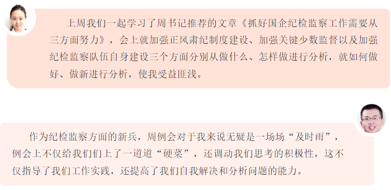 紀檢監察業務周例會是大豐港區提高紀檢條線工作能力的方式,也是建設學習型紀檢干部的有效嘗試?!皩W習要有干貨,不能搞花架子,要了解我們的干部最需要學什么,緊貼實際需求和工作要求來安排學習內容?!贝筘S港區紀檢相關負責人表示,深化監察體制改革,對紀檢監察干部的業務能力提出了更高更嚴的要求,學習就是要著力補短板、強弱項,解決紀檢監察干部本領“恐慌”問題。例會上,就集團紀委下發文件精神進行剖析、對日常監督如何抓、信息宣傳選題立意、特色亮點提煉歸納進行培訓。會上還提倡“我的問題大家答”,組織交流討論、現場解答,鼓勵善于發現問題,積極解決問題,創新理念思路,確??梢浴俺潆娧a能”,提升業務能力。