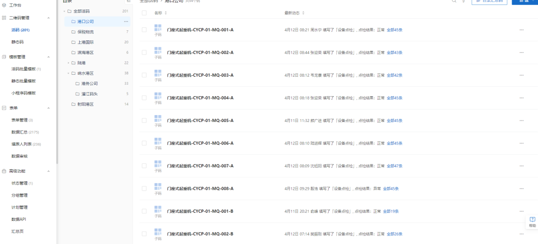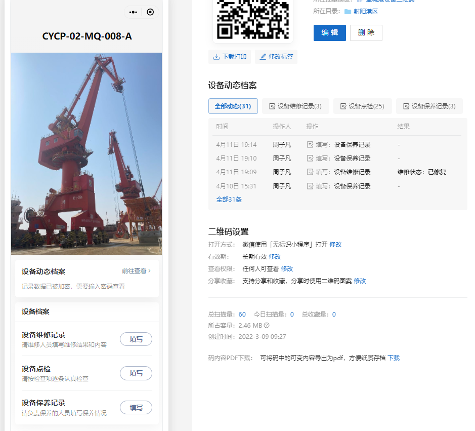 現(xiàn)場維護保養(yǎng)人員通過掃描港口設(shè)備上的二維碼,即可將設(shè)備維修、點檢和保養(yǎng)記錄錄入設(shè)備二維碼中,后臺數(shù)據(jù)實時更新,管理人員可隨時隨地查看全集團港口設(shè)備的運行情況,實現(xiàn)集團集中掌握全部港口設(shè)備的運行狀態(tài),提升了設(shè)備管理效率,對出現(xiàn)的問題能夠及時解決。同時,利用大數(shù)據(jù)匯總分析設(shè)備的整體狀態(tài),可以對設(shè)備后期的采購、維護保養(yǎng)提供一定建議。