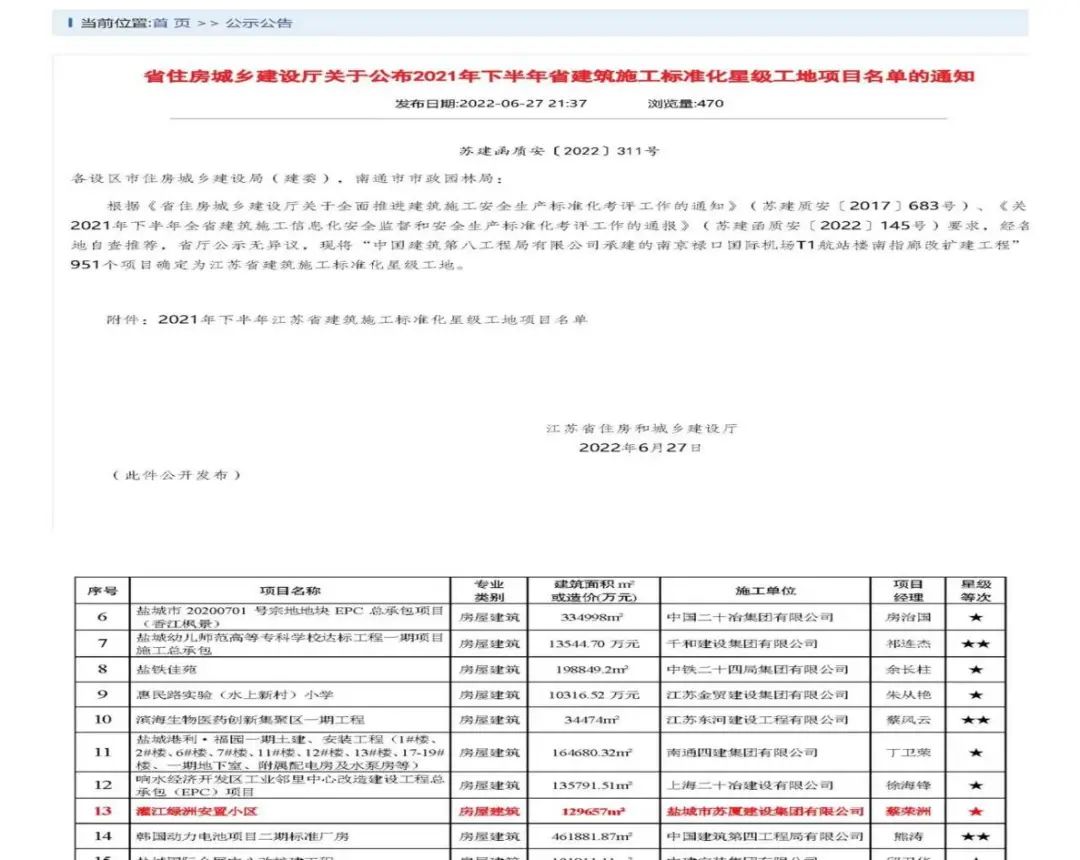 近日,鹽城港集團灌江綠洲安置小區(qū)項目在榮獲“鹽城市建筑施工標準化示范工地”稱號后,再次榮獲“2021年下半年江蘇省建筑施工標準化星級工地”稱號。