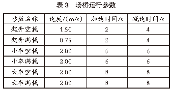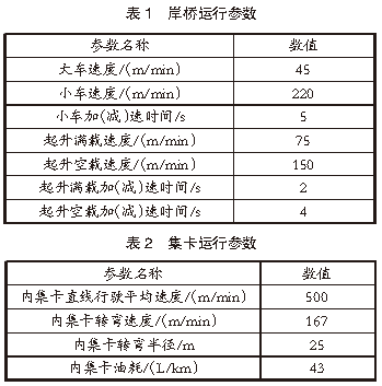 堆場(chǎng)仿真參數(shù):2.1 堆場(chǎng)布局參數(shù)港口裝卸作業(yè)區(qū)布置2個(gè)10萬(wàn)噸級(jí)泊位,每個(gè)泊位配備3臺(tái)岸橋,總計(jì)6臺(tái)岸橋,編號(hào)分別為Crane 1、Crane 2、Crane 3、Crane 4、Crane 5、Crane 6。港口堆場(chǎng)作業(yè)區(qū)規(guī)劃有4個(gè)箱區(qū),編號(hào)分別為E01、E02、E03、E04。在堆場(chǎng)布置方面,E01箱區(qū)為近海側(cè)箱區(qū),E04箱區(qū)為近陸側(cè)箱區(qū),E01、E02箱區(qū)為出口箱區(qū),E03、E04箱區(qū)為進(jìn)口箱區(qū)。在港口堆場(chǎng)作業(yè)區(qū)規(guī)劃中,將E01箱區(qū)設(shè)置為9列5層箱區(qū),E02、E03、E04箱區(qū)設(shè)置為12排5層箱區(qū),每個(gè)箱區(qū)配備有2臺(tái)場(chǎng)橋協(xié)同作業(yè),總計(jì)8臺(tái)場(chǎng)橋,編號(hào)分別為A01、A02、A03、A04、A05、A06、A07、A08。2.2 堆場(chǎng)設(shè)備參數(shù)港口堆場(chǎng)作業(yè)設(shè)備主要包括場(chǎng)橋、岸橋、集卡等,上述設(shè)備的運(yùn)行參數(shù)即為堆場(chǎng)仿真系統(tǒng)的輸入?yún)?shù)。根據(jù)實(shí)際集裝箱堆場(chǎng)作業(yè)數(shù)據(jù),對(duì)作業(yè)設(shè)備進(jìn)行參數(shù)設(shè)置。岸橋運(yùn)行參數(shù)見(jiàn)表1,集卡運(yùn)行參數(shù)見(jiàn)表2,場(chǎng)橋運(yùn)行參數(shù)見(jiàn)表3。