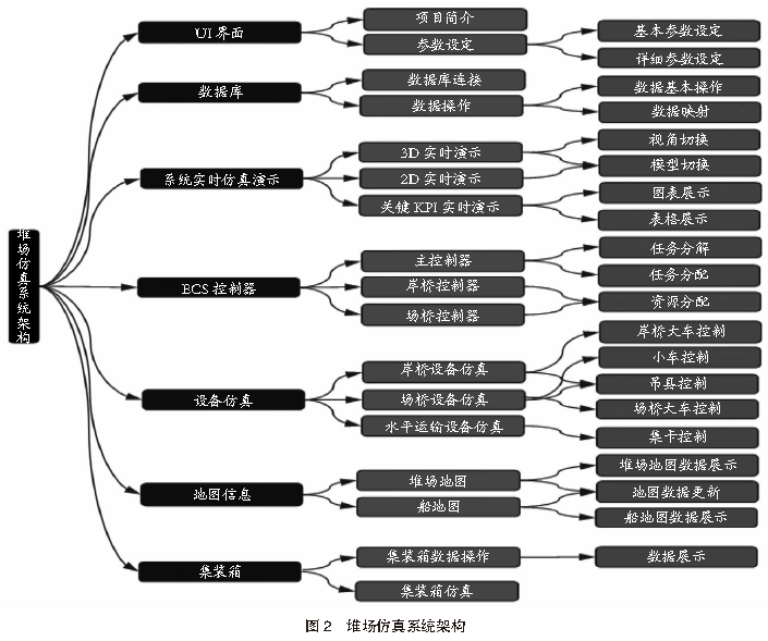 3仿真模型搭建3.1 堆場(chǎng)仿真系統(tǒng)架構(gòu)根據(jù)港口堆場(chǎng)作業(yè)特點(diǎn)和堆場(chǎng)系統(tǒng)功能,設(shè)計(jì)搭建港口堆場(chǎng)仿真系統(tǒng)架構(gòu)。該架構(gòu)主要包括UI界面、數(shù)據(jù)庫(kù)、系統(tǒng)實(shí)時(shí)仿真演示、ECS控制器、設(shè)備仿真、地圖信息、集裝箱等部分,主要用于實(shí)現(xiàn)數(shù)據(jù)交互、模型設(shè)計(jì)、任務(wù)調(diào)度管理、仿真測(cè)試、結(jié)果演示等功能。堆場(chǎng)仿真系統(tǒng)架構(gòu)見(jiàn)圖2。