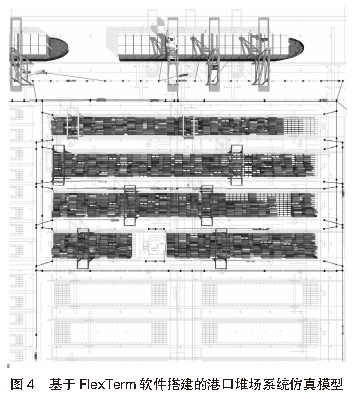 3.2 堆場(chǎng)仿真系統(tǒng)模型根據(jù)堆場(chǎng)仿真系統(tǒng)架構(gòu),以某港口自動(dòng)化堆場(chǎng)作業(yè)的實(shí)際運(yùn)行環(huán)境為基礎(chǔ),分別搭建基于AnyLogic軟件和FlexTerm軟件的港口自動(dòng)化堆場(chǎng)系統(tǒng)仿真模型?;贏nyLogic軟件搭建的港口堆場(chǎng)系統(tǒng)仿真模型見(jiàn)圖3,基于FlexTerm軟件搭建的港口堆場(chǎng)系統(tǒng)仿真模型見(jiàn)圖4。