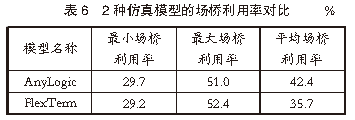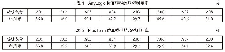 4仿真結(jié)果分析利用港口自動(dòng)化堆場(chǎng)相關(guān)數(shù)據(jù),分別對(duì)基于AnyLogic軟件和FlexTerm軟件的堆場(chǎng)系統(tǒng)仿真模型的仿真結(jié)果進(jìn)行對(duì)比分析。4.1 場(chǎng)橋利用率對(duì)比在集裝箱堆場(chǎng)作業(yè)中,場(chǎng)橋是提高堆場(chǎng)作業(yè)效率的關(guān)鍵因素。合理分析場(chǎng)橋利用率對(duì)提高堆場(chǎng)作業(yè)效率、減少船舶在港停泊時(shí)間尤為重要。根據(jù)港口提供的堆場(chǎng)作業(yè)參數(shù)和實(shí)際堆場(chǎng)作業(yè)的場(chǎng)橋利用情況,對(duì)堆場(chǎng)內(nèi)場(chǎng)橋使用情況進(jìn)行仿真對(duì)比分析。AnyLogic仿真模型的場(chǎng)橋利用率見(jiàn)表4,F(xiàn)lexTerm仿真模型的場(chǎng)橋利用率見(jiàn)表5,2種仿真模型的場(chǎng)橋利用率對(duì)比見(jiàn)表6。