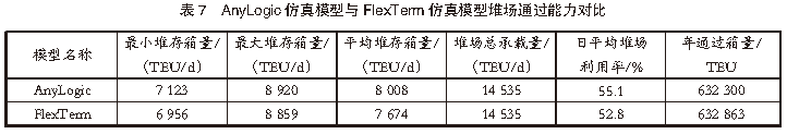 經(jīng)綜合分析發(fā)現(xiàn),無(wú)論是單一場(chǎng)橋利用率還是平均場(chǎng)橋利用率,AnyLogic仿真模型的數(shù)據(jù)結(jié)果都普遍高于FlexTerm仿真模型的數(shù)據(jù)結(jié)果。通過(guò)分析堆場(chǎng)作業(yè)系統(tǒng)仿真流程發(fā)現(xiàn),上述差異是由2種仿真模型的作業(yè)指令生成模式不同導(dǎo)致的。在相同的作業(yè)時(shí)段內(nèi),AnyLogic仿真模型的作業(yè)指令生成的作業(yè)數(shù)量要高于FlexTerm仿真模型的作業(yè)指令生成的作業(yè)數(shù)量,從而導(dǎo)致AnyLogic仿真模型的場(chǎng)橋利用率高于FlexTerm仿真模型的場(chǎng)橋利用率。根據(jù)港口提供的數(shù)據(jù),全年該港口自動(dòng)化堆場(chǎng)的場(chǎng)橋利用率在40%~60%?;贏nyLogic仿真模型和FlexTerm仿真模型仿真得到的平均場(chǎng)橋利用率分別為42.4%、35.7%。顯然,與FlexTerm仿真模型的仿真結(jié)果相比,AnyLogic仿真模型的仿真結(jié)果同實(shí)際作業(yè)數(shù)據(jù)的統(tǒng)計(jì)結(jié)果更接近。究其原因,這是由2款仿真模型的集裝箱裝卸作業(yè)指令的生成模式不同導(dǎo)致的。對(duì)堆場(chǎng)作業(yè)系統(tǒng)仿真流程分析發(fā)現(xiàn):在AnyLogic仿真模型中,集裝箱裝卸作業(yè)指令是根據(jù)港口歷史數(shù)據(jù),借助算法計(jì)算生成的,比較接近港口的實(shí)際作業(yè)數(shù)據(jù);在FlexTerm仿真模型中,集裝箱裝卸作業(yè)指令是利用軟件自帶作業(yè)計(jì)劃模塊,通過(guò)配置船期、堆場(chǎng)計(jì)劃等參數(shù)自動(dòng)生成的,與港口實(shí)際作業(yè)數(shù)據(jù)之間存在一定的差距。4.2 堆場(chǎng)使用情況對(duì)比為了合理規(guī)劃堆場(chǎng)空間資源,根據(jù)港口提供的船期、堆場(chǎng)計(jì)劃等參數(shù),對(duì)港口堆場(chǎng)的使用情況進(jìn)行仿真對(duì)比分析。AnyLogic仿真模型與FlexTerm仿真模型堆場(chǎng)通過(guò)能力對(duì)比見(jiàn)表7。由表7可知,在相同輸入條件下,AnyLogic仿真模型和FlexTerm仿真模型仿真模擬得到的堆場(chǎng)利用情況和堆場(chǎng)通過(guò)能力基本一致。但由于泊位船舶計(jì)劃較為寬松,船期密度小于實(shí)際船期數(shù)據(jù),AnyLogic仿真模型和FlexTerm仿真模型的堆場(chǎng)通過(guò)箱量分別為632 300 TEU和632 863 TEU,均小于港口全年實(shí)際堆場(chǎng)通過(guò)箱量724 272 TEU。