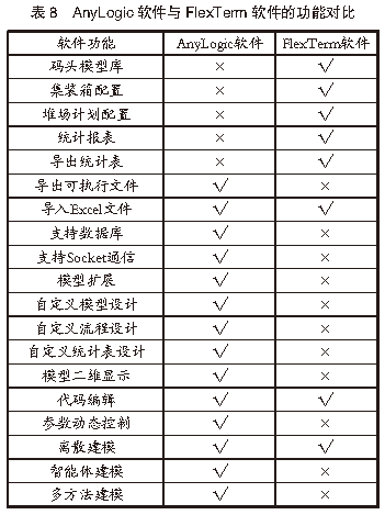 通過(guò)仿真分析結(jié)果與實(shí)際作業(yè)數(shù)據(jù)的對(duì)比發(fā)現(xiàn),仿真分析結(jié)果與港口實(shí)際運(yùn)行數(shù)據(jù)差距較小,表明AnyLogic仿真模型和FlexTerm仿真模型都能準(zhǔn)確可靠地模擬港口實(shí)際堆場(chǎng)作業(yè)情況,能夠滿足港口堆場(chǎng)仿真需求,并有助于提高港口堆場(chǎng)仿真的準(zhǔn)確度和可信度。此外,通過(guò)分析堆場(chǎng)仿真作業(yè)流程還發(fā)現(xiàn),通過(guò)調(diào)整堆場(chǎng)仿真系統(tǒng)的輸入條件能提升AnyLogic仿真模型和FlexTerm仿真模型的仿真效果,其中:通過(guò)調(diào)整輸入條件對(duì)應(yīng)的關(guān)鍵參數(shù)來(lái)提升AnyLogic仿真模型的仿真效果;通過(guò)修改輸入條件中作業(yè)計(jì)劃模塊的船期、堆場(chǎng)計(jì)劃等相關(guān)配置來(lái)提升FlexTerm仿真模型的仿真效果。4.3 軟件功能對(duì)比回顧整個(gè)堆場(chǎng)仿真作業(yè)流程發(fā)現(xiàn),2款軟件在功能應(yīng)用方面存在一定差異。根據(jù)仿真作業(yè)流程和仿真分析結(jié)果,對(duì)2款軟件的功能進(jìn)行對(duì)比分析,AnyLogic軟件與FlexTerm軟件的功能對(duì)比見(jiàn)表8。