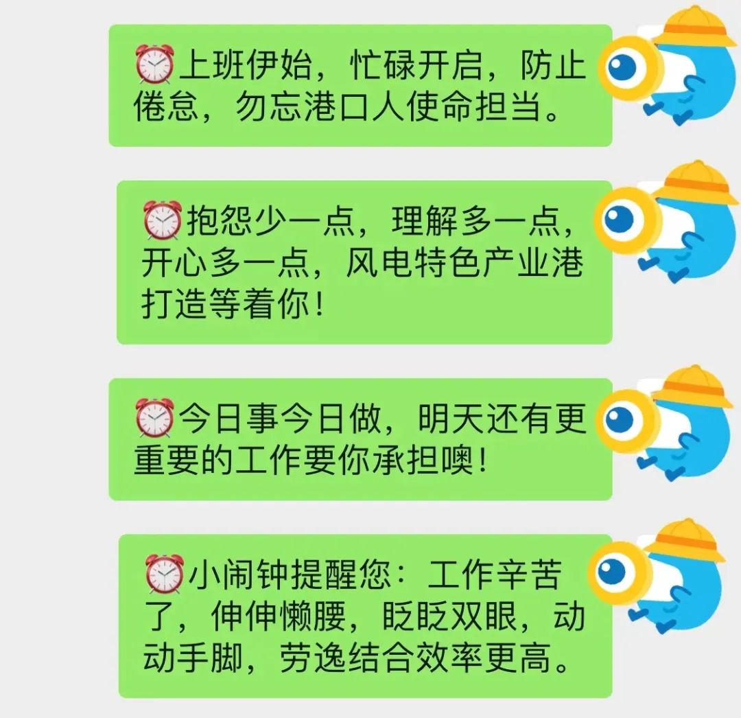 “鬧鐘小貼士”,既勵(lì)志又暖心,體現(xiàn)了港區(qū)對(duì)員工的人文關(guān)懷,激勵(lì)員工立足本職、又提醒員工注意勞逸結(jié)合、放松身心,更高效的完成工作。對(duì)此員工們紛紛表示,“鬧鐘小貼士”有利于讓大家更好地調(diào)整好自身狀態(tài),練就“寬肩膀”,勇挑“千斤擔(dān)”,以更加昂揚(yáng)的斗志,勇立潮頭,激情拼搏,為港區(qū)的發(fā)展和建設(shè)貢獻(xiàn)自己的一份力量。