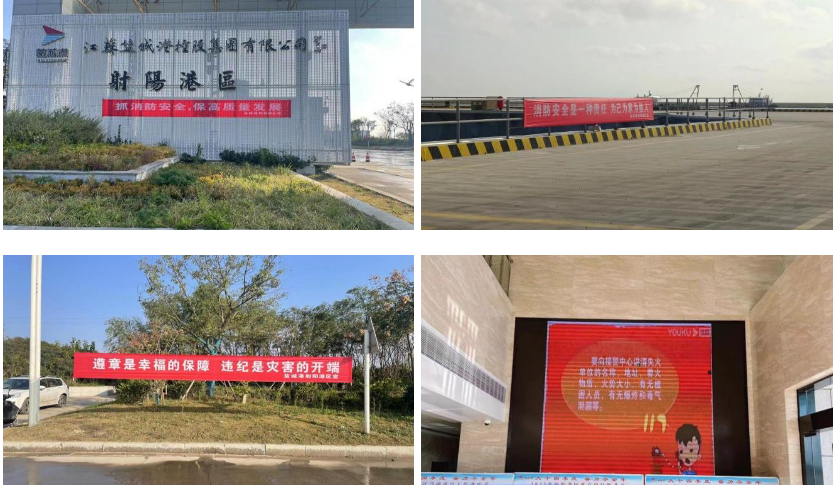 注重宣傳引導,在增強輻射力帶動力上下功夫。為做好消防宣傳月活動,進一步普及消防安全知識,全面提升港區全員的消防安全意識,提高自護、自救和互助能力,射陽港區通過在港區張貼消防宣傳海報,懸掛消防宣傳橫幅,辦公區大屏循環播放消防安全宣傳片等方式,大力宣傳消防安全科普知識,增強港區全員消防安全意識。