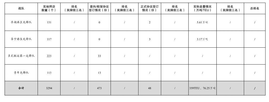活動開展以來,累計拜訪客戶數(shù)量3294家,簽訂意向/框架協(xié)議數(shù)量473份,簽訂正式協(xié)議48份,實際走量359TEU、76.25萬噸。