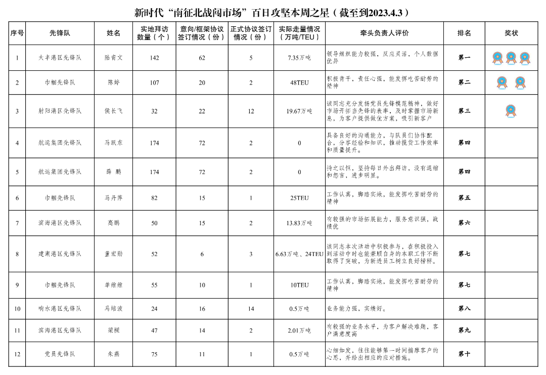 第一名:大豐港區(qū)先鋒隊 陸青文(拜訪客戶142家,簽訂意向協(xié)議62份,簽訂正式協(xié)議5份,實際走量7.35萬噸)
