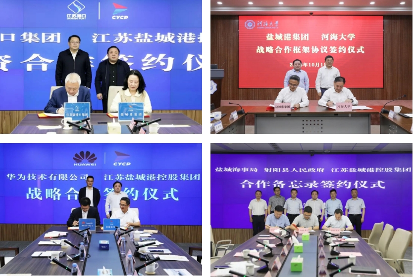之所以能有如此亮眼的成績單,離不開鹽城港構建的全面合作網絡。三年來,面對沿海港口千帆競發的發展格局,鹽城港全面搶抓淮河生態經濟帶、江蘇沿海發展、長三角一體化三個國家戰略以及RCEP自貿區“一橫一縱一圈一區”戰略疊加機遇,以開放的姿態尋求多元化合作。遵循合作共贏、優勢互補的原則,在“港政、港港、港企、港校、港行”聯動發展上持續發力,先后與地方政府、大型港口集團、腹地企業、高等院校、科研院所、港口相關行業單位簽訂戰略合作協議66份。