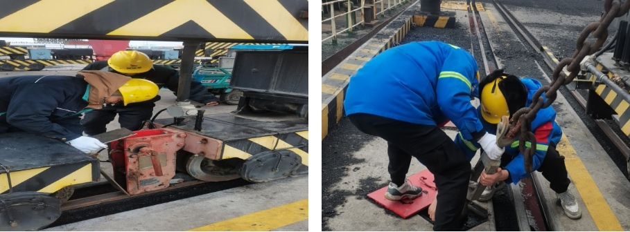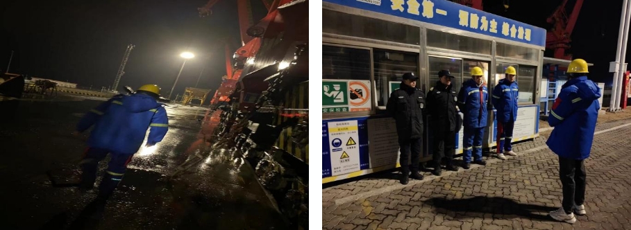 是班組長、是設備保障員,也是黨員。“我是黨員我先上”是我們每個人的行為準則。寒潮來臨前,他們仔細檢查門機錨定插板、防風拉鎖、防爬器、鐵楔是否完全插入槽內;利用加桿檢查鏈條連接環是否受力至最大值;嚴格檢測防爬器是否落地牢靠;確保惡劣天氣下港區安全有序。