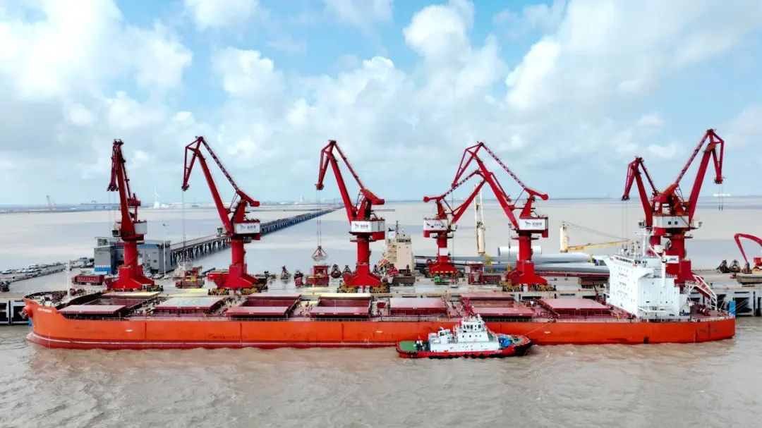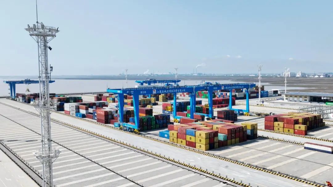 堆場上,堆積如山的集裝箱在秋陽的映照下,閃耀著迷人的光澤。碼頭門機(jī)忙碌地吊運(yùn)著,與秋天的寧靜形成了鮮明的對比。