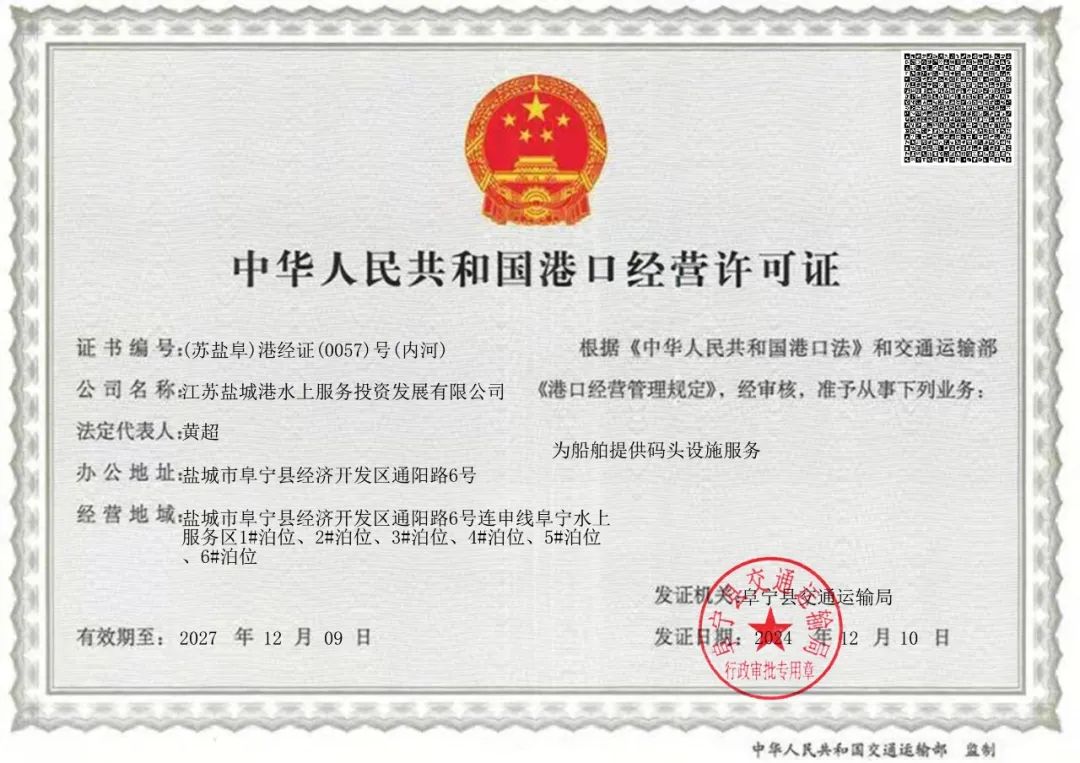數月來,經過交通部門現場指導,對照清單要求,水上服務公司工作專班第一時間匯總遞交各類辦證資料,先后完成環評、安評、安全應急預案、沉降檢測等項目。水上服務區高質量完成設計批復的工程內容,驗收資料齊全,滿足竣工驗收條件,碼頭項目順利通過竣工驗收,并于12月9日順利取得《中華人民共和國港口經營許可證》,獲準水上服務公司從事為船舶提供碼頭設施服務。