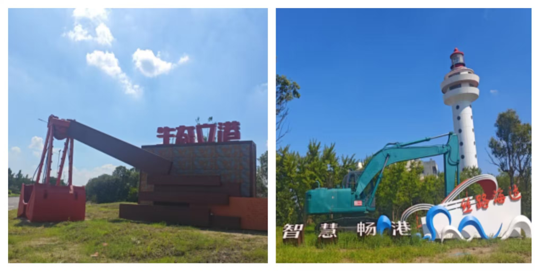 轉(zhuǎn)角處,一臺(tái)閑置輪胎式起重機(jī)穩(wěn)穩(wěn)“站”在特制的碼頭造型基座上。它那剛勁的鋼鐵骨架,高高托舉著象征物流單元的集裝箱雕塑,瞬間將人拉回吊臂揮舞、貨柜起落的繁忙碼頭現(xiàn)場(chǎng)。這個(gè)場(chǎng)景暗藏雙重密碼:穩(wěn)固的姿態(tài)是“平安發(fā)展”的無聲誓言,而“吞吐量齊頭并進(jìn)”的蓬勃造型,則大聲宣告著“港興潮起通天下”的開放雄心!