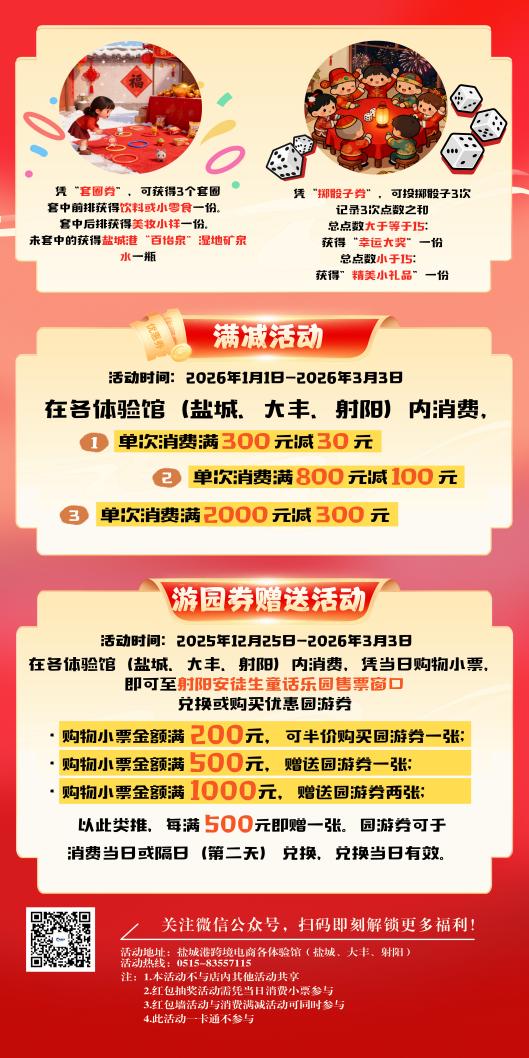 買年貨的同時(shí),別忘為親子時(shí)光添份樂趣!活動(dòng)期間,憑當(dāng)日購(gòu)物小票即可前往射陽安徒生童話樂園兌換專屬游園優(yōu)惠。單筆消費(fèi)滿500元即贈(zèng)游園券1張,多買多贈(zèng),讓童話世界的歡聲笑語,成為這個(gè)新年最溫暖的記憶。