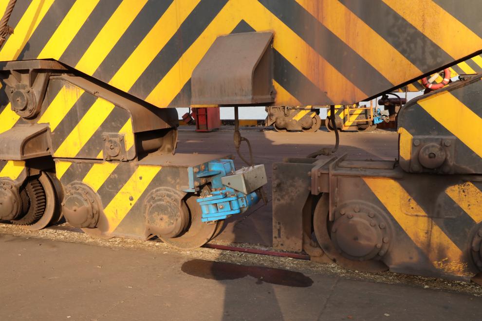 該裝置工作原理類似于汽車的“剎車盤”。當強風吹動門機滑移20至30公分時,系統內置的自動編碼器會即時感應并觸發夾輪器,將行走輪牢牢鎖死在軌道上,形成剛性制動。這套系統響應迅速、制動可靠,從根本上提升了大型機械在惡劣天氣下的抗風能力與作業穩定性。