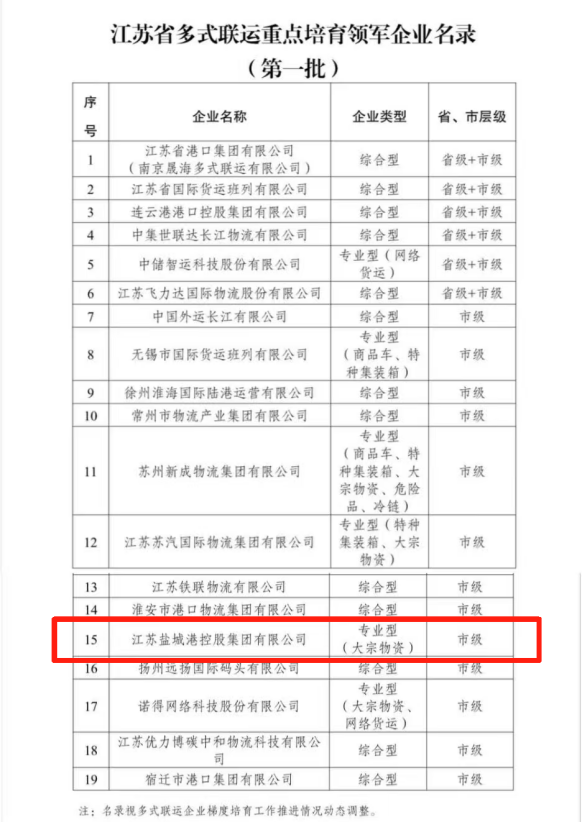 近日,江蘇省交通運輸廳出臺《江蘇省推動多式聯運企業梯度培育工作方案》,并公布第一批19家重點培育企業名錄。鹽城港集團憑借在多式聯運領域的突出成績和顯著發展潛力,成功入選“江蘇省多式聯運重點培育領軍企業名錄(專業型)”。