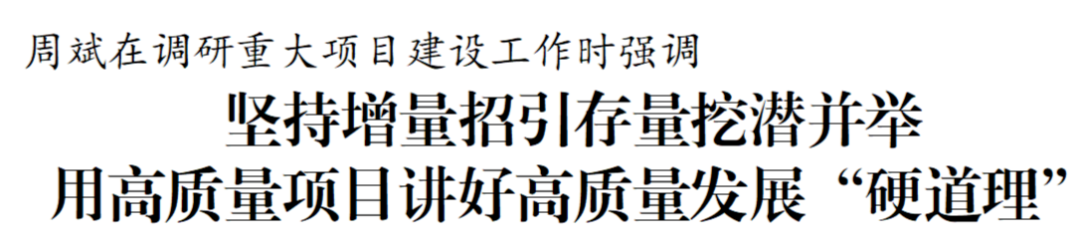 周斌在調研中強調,重大項目是經(jīng)濟社會高質量發(fā)展的“加速器”和“壓艙石”。今年各項工作已經(jīng)進入下半場,各地各部門要增強時不我待的緊迫感,堅持一切圍著項目轉、一切盯著項目干,推動重大項目建設跑出“加速度”,用高質量項目講好高質量發(fā)展“硬道理”。要堅持增量招引和存量挖潛并舉,既注重招引新項目、好項目,又鼓勵引導現(xiàn)有企業(yè)開展“智改數(shù)轉網(wǎng)聯(lián)”、技改擴能項目投資。要積極推動制造業(yè)數(shù)字化轉型,促進專精特新企業(yè)蓬勃發(fā)展,培育壯大智能產(chǎn)業(yè),加快構建現(xiàn)代化產(chǎn)業(yè)體系,為推進中國式現(xiàn)代化鹽城新實踐提供堅實支撐。