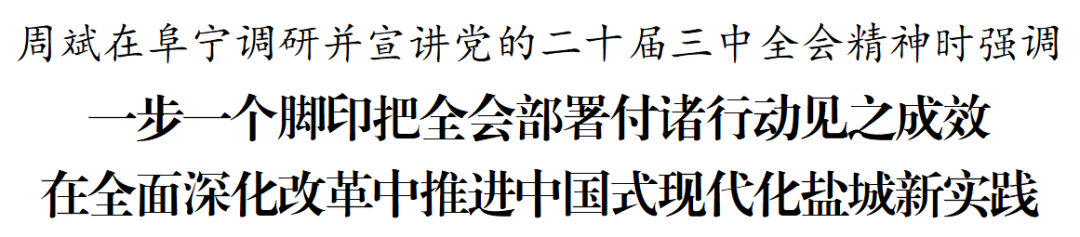 8月2日,市委書記周斌在阜寧縣調(diào)研并宣講黨的二十屆三中全會(huì)精神。他強(qiáng)調(diào),要把學(xué)習(xí)貫徹黨的二十屆三中全會(huì)精神作為當(dāng)前和今后一個(gè)時(shí)期的重大政治任務(wù),用心學(xué)習(xí)領(lǐng)會(huì),全面深化理解,廣泛宣傳宣講,一步一個(gè)腳印把全會(huì)改革部署付諸行動(dòng)、見之成效,在全面深化改革中推進(jìn)中國式現(xiàn)代化鹽城新實(shí)踐。