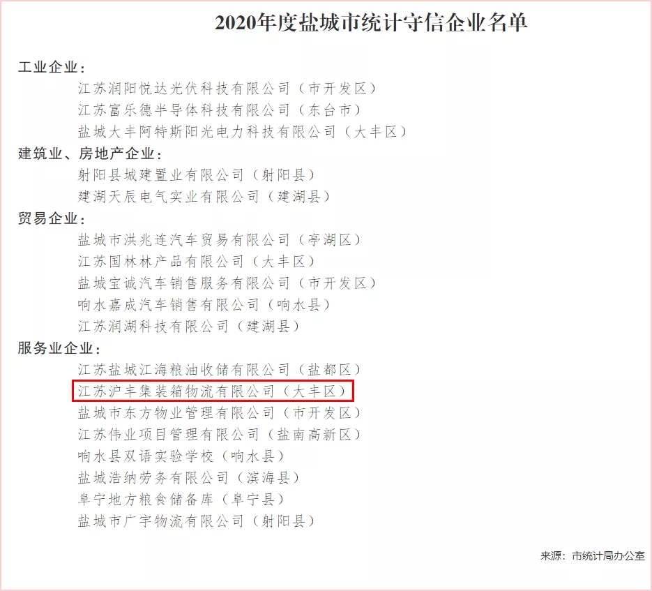 近日,通過嚴格審核,鹽城港滬豐集裝箱公司被鹽城市統(tǒng)計局評為“2020年度統(tǒng)計守信企業(yè)”,充分體現(xiàn)了滬豐公司重視和加強誠信管理體系建設(shè)所作出的努力,對塑造公司誠信經(jīng)營形象、提升物流市場競爭力具有重要意義。